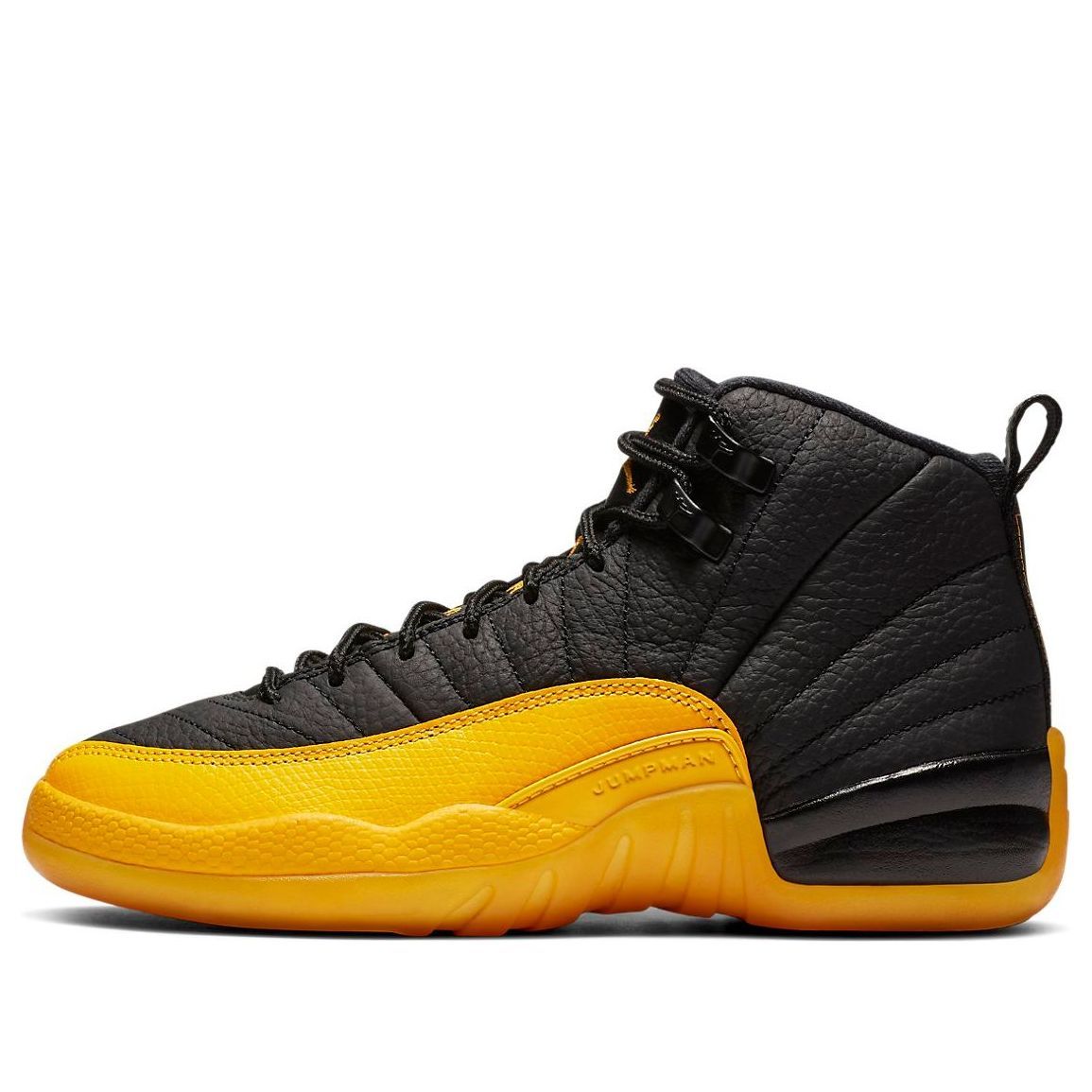 The Nithtke Aithtr Jorthtdan 12 Retro "University Gold" features a two-tone color scheme with a black leather upper and bright yellow mudguard with lizard patterns. The vibrant yellow extends to the entire length of the sole.